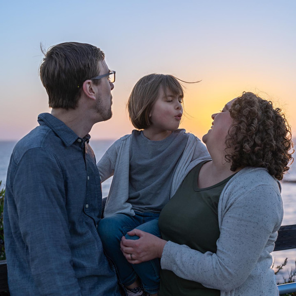 2022 Within a family's embrace, beneath the sun's final caress, a tableau unfolds—parents and child share a gaze that speaks of endless love, a cherished moment framed by the setting sun.