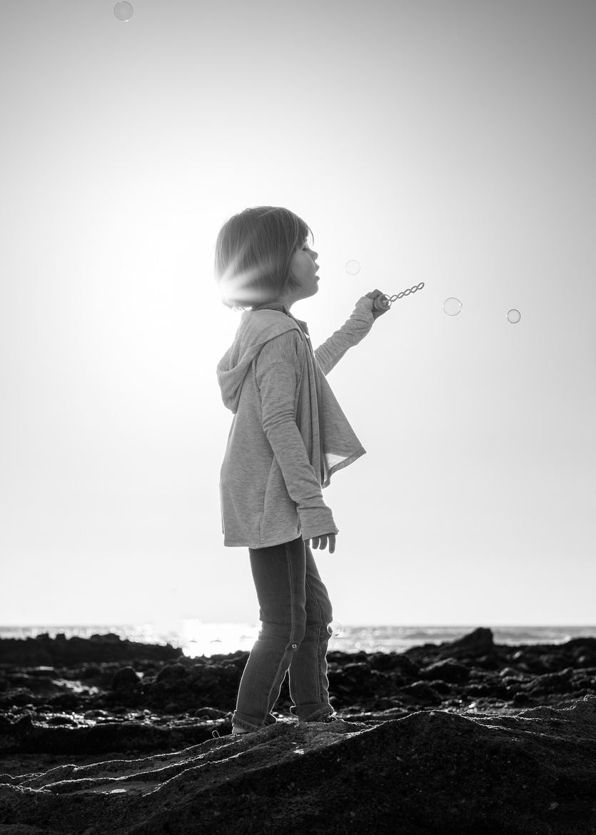 2022 Beneath the setting sun's golden embrace, blew iridescent bubbles at the water's edge